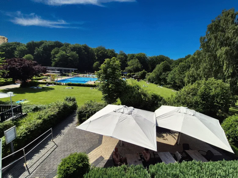 Ein gepflegter Außenpool steht Ihnen in den Sommermonaten zur freien Nutzung bereit.